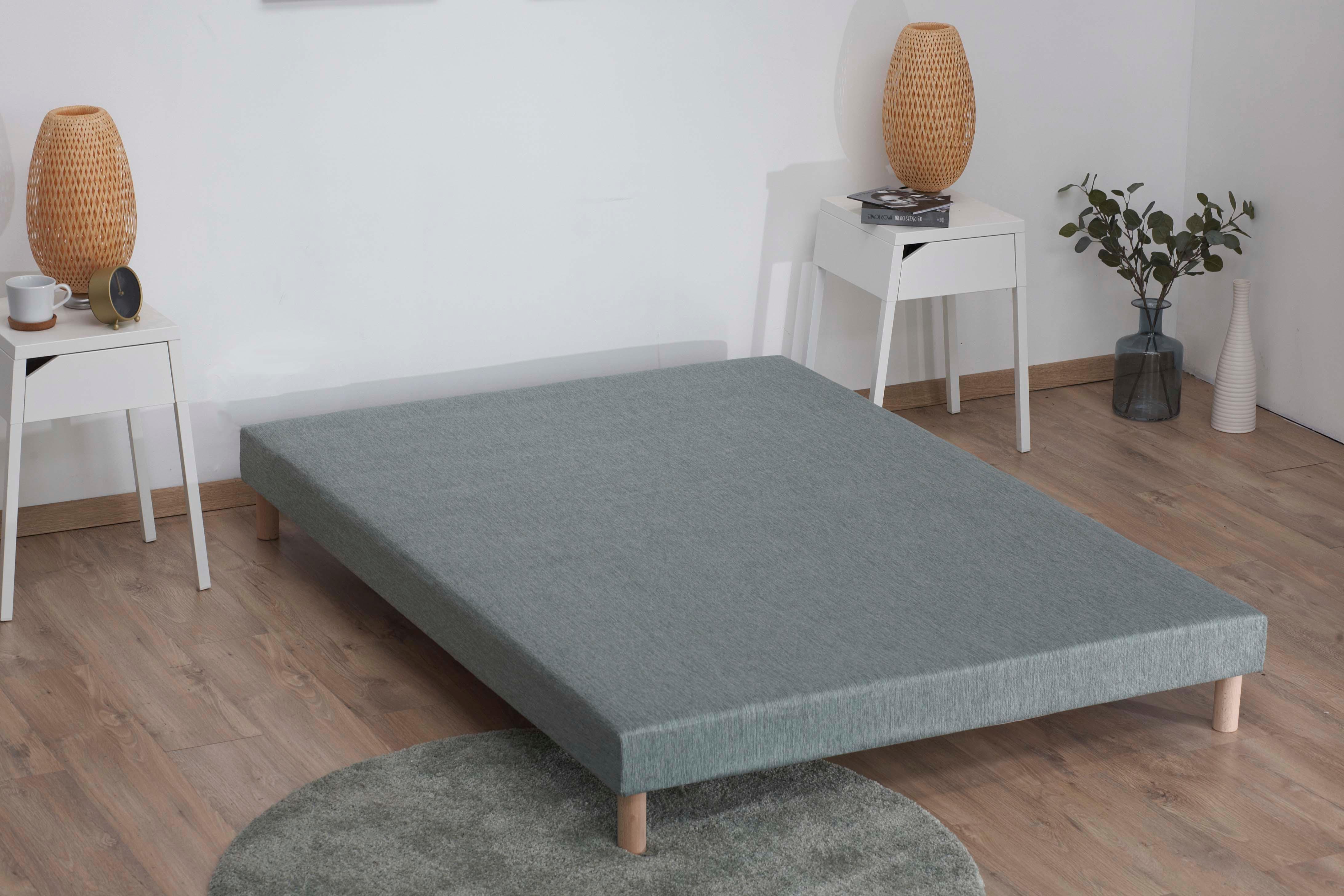 Sommier HYGGE avec revêtement en tissu d'ameublement vert céladon et composé de 4 pieds en bois brut d'une hauteur de 12cm.