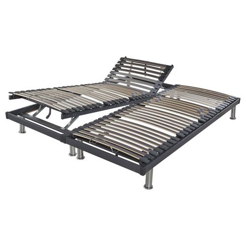 Sommier de relaxation à mécanisme manuel, permettant de relever la tête et les pieds indépendamment à l'aide de poignées. Positions réglables par crémaillères. Zone lombaire, 4 double lattes avec régulateurs de confort indépendants, doubles suspensions ergodynamiques en élastomère. Existe en taille 2X90X190 cm, 140X190 cm et 2X80X190 cm