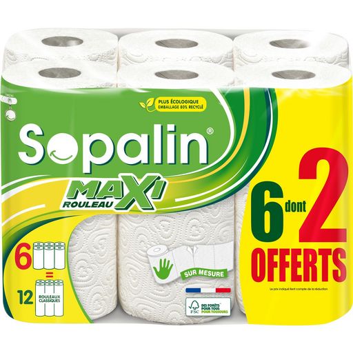 Essuie-Tout Sopalin Sur Mesure Blanc FSC x6D2 rouleaux Sopalin® Sur mesure Blanc, l’essuie-tout blanc en format maxi rouleau, plus haut et 2 fois plus long qu’un rouleau classique, vous le changez moins souvent. Grâce à ses feuilles adaptées à la taille de la main il est plus pratique et vous permet de gaspiller moins.