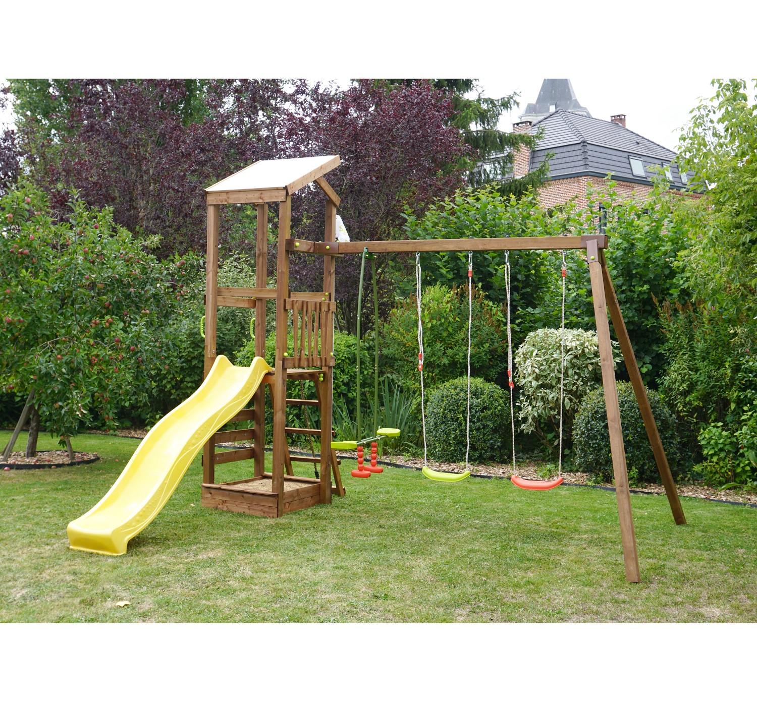 L’aire de jeux Féréo de la gamme Soulet est composée de d'une tour et d’un portique. La tour est équipée d’une plateforme à 120 cm de haut d’un toit en pente, d’un toboggan, d’une corde à grimper et d’un bac à sable. Le portique dispose de deux balançoires et d’un vis-à-vis. Vos enfants passeront de beaux moments dans votre jardin lors de belles journées d'été ! Sa structure est faite en pin sylvestre traité autoclave marron classe 4. Ainsi, elle dispose d’une garantie de 5 ans contre les Champignons qui vous assure une solidité et une qualité pour la sécurité et le bien-être de vos enfants.