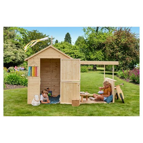 Vos enfants vont pouvoir s'émerveiller et s'amuser durant les beaux jours avec cette magnifique maisonnette en bois Eugenie. Une partie pour s'abriter et une autre pour profiter du soleil et de l'air frais !