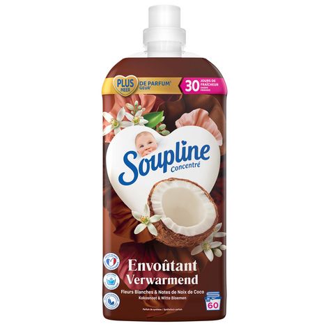 Assouplissant Soupline Concentré Envoûtant aux Fleurs blanches & notes de Noix de coco. Maintenant avec la technologie de parfum Emotiboost qui améliore votre humeur. L'assouplissant est doté d'une technologie révolutionnaire de parfum 3D.