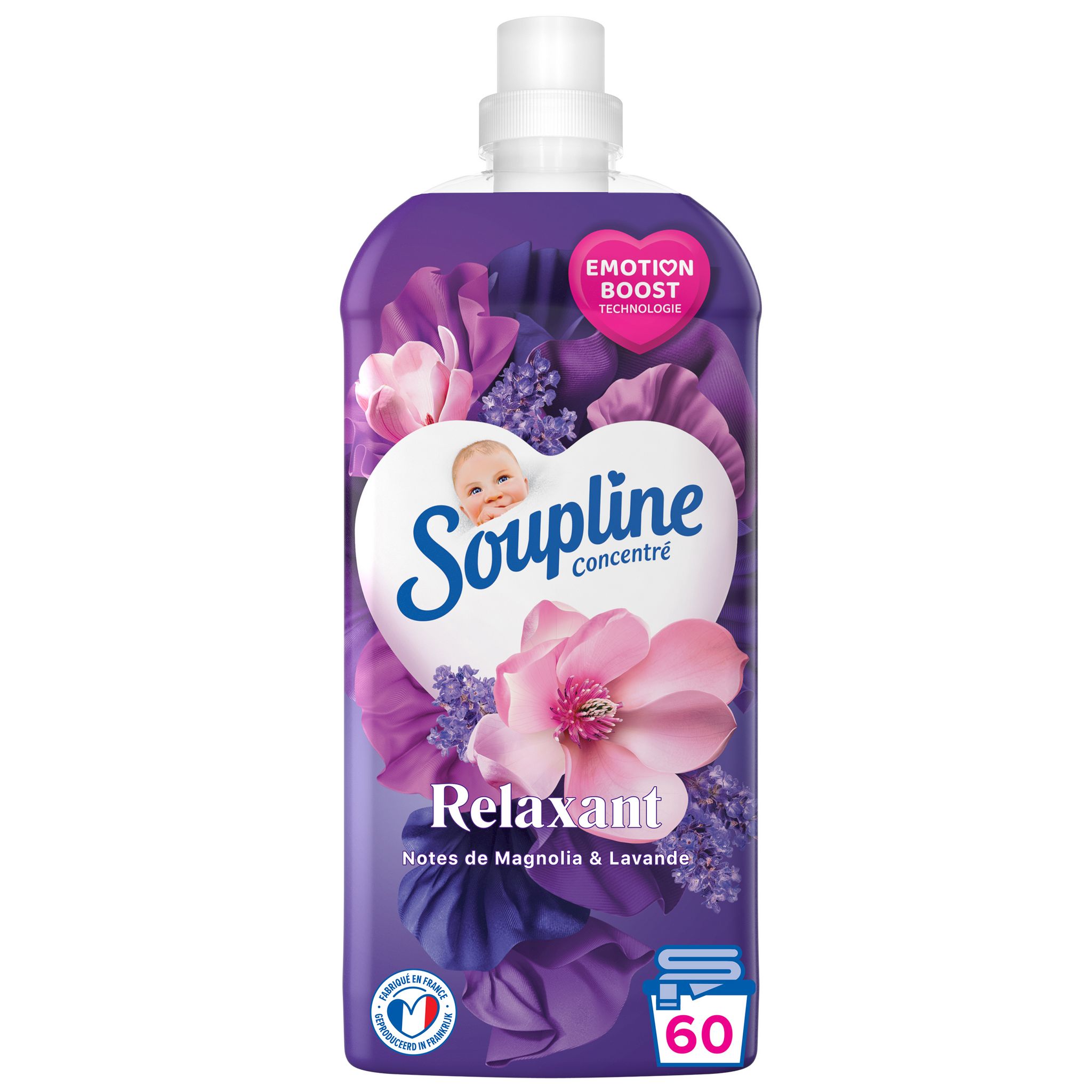 Assouplissant Soupline Concentré Relaxant aux notes de Magnolia & Lavande. Maintenant avec la technologie de parfum Emotiboost qui améliore votre humeur. L'assouplissant est doté d'une technologie révolutionnaire de parfum 3D.