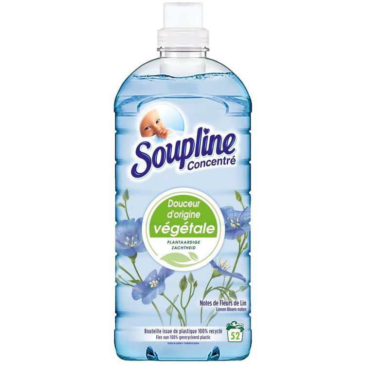 Assouplissant pour linge composé d'une formule testée dermatologiquement qui laisse votre linge doux et l'enveloppe d'un irrésistible parfum avec des extraits naturels. Nous n'utilisons que du plastique recyclé pour cette bouteille, n'oubliez pas de lui donner une deuxième vie en la recyclant. Adoucissant Soupline Douceur végétale Notes de Fleurs de Lin 52 lavages - 1,3L