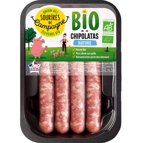 Ingrédients : Ingrédients : viande porcine* origine France 88 %, eau, sel de Camargue, conservateur : vinaigre tamponné*, sirop de glucose*, dextrose*, épices*, arômes naturels de romarin, d'agrume, d'acérola et d'épices, plante aromatique*, boyau naturel de mouton.
