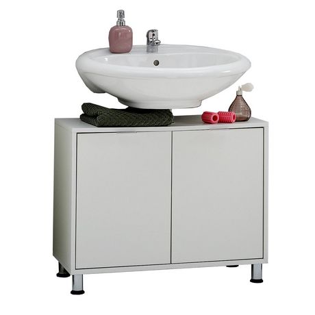 Meuble sous vasque blanc pour salle de bain avec une structure en panneaux de particules mélaminés, composé de 2 portes avec une étagère intérieure.