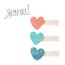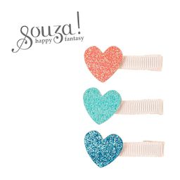 Lot de trois barrettes à cheveux coeur Bracha de la marque hollandaise Souza ! Chacun d'entre eux possède une application de paillettes : bleu marine, bleu et pêche. La partie métallique des broches est recouverte de matière (ruban gros grain). Les pinces dentelées garantissent que les décorations tiennent fermement dans les cheveux.