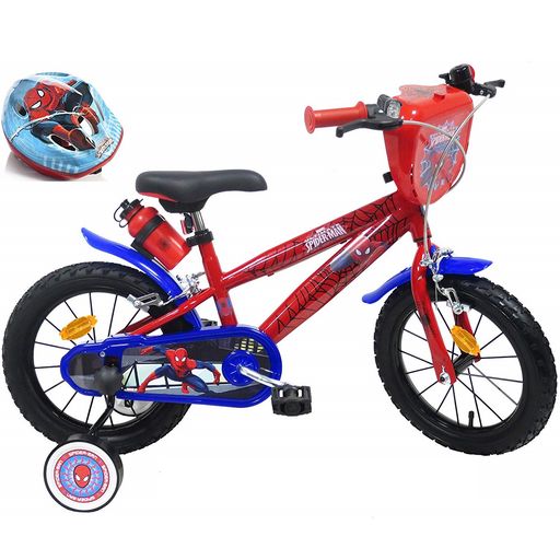 Vélo 14'' SPIDERMAN , Ce vélo est aussi équipé de 2 Freins avant et arrière Caliper - Transmission Monovitesse - Roue libre - Pneus Gonflables - Jantes à rayons - Roulement Nylon sur Direction & Pédalier - Selle et guidon reglable pour suivre la croissance de votre enfant - Accessoires : Plaque décorative à l'avant - Garde-boue avanr et arrière - Carter de protection - Sonnette - Eclairage à pile fournies - Stabilisateurs avec montage sans outils - Catadioptres des roues + Casque SPIDERMAN INCLUS!