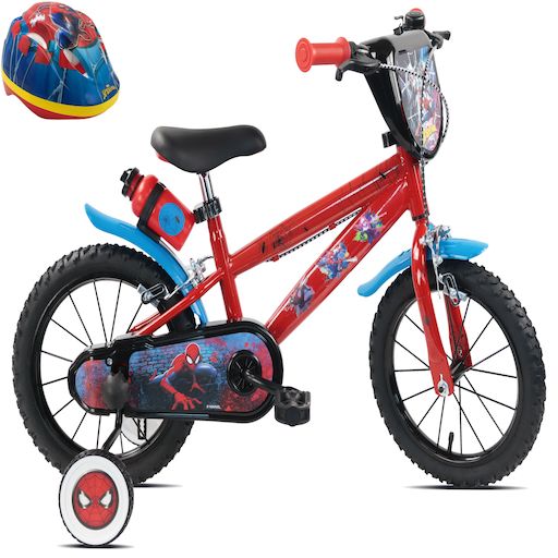 Vélo enfant 14'' SPIDERMAN (90 à 105cm) équipé de 2 freins, plaque avant décorative , bidon arrière, stabilisateurs + CASQUE INCLUS!