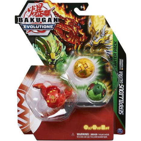 - Un coffret de démarrage contenant tout le nécessaire pour constituer son équipe de 3 billes et se lancer directement dans le combat : 2 Bakugan classiques + 1 Bakugan Ultra avec transformation spéciale, 6 tuiles BakuCore, 3 cartes Personnage, 3 cartes Maîtrise, 1 carte Portail et une règle de combat.