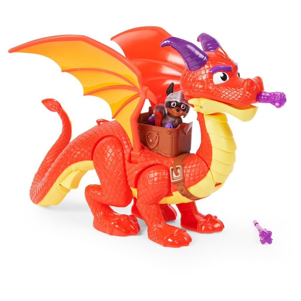 Un coffret pour partir en mission Chevaliers avec La Pat' Patrouille ! Braise le dragon dispose d'ailes fonctionnelles à activer grâce au bouton sous sa queue et d'un lance-projectiles pour partir en mission avec Croc, le nouveau chiot de La Pat' Patrouille. Place Croc sur le dragon et pars en missi