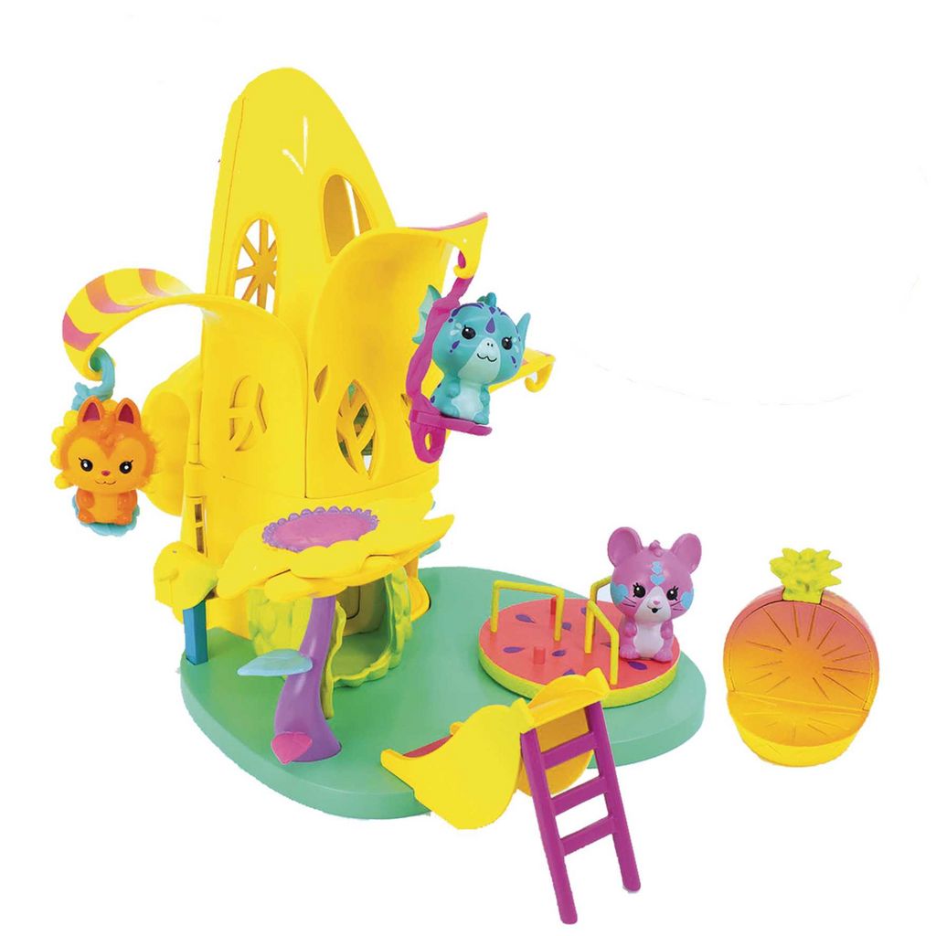 1 maison banane avec des objets extérieurs (tobbogan, tourniquet), 1 animal exclusif, 1 liane, des stickers, 2 mini-figurines, 1 poster de collection