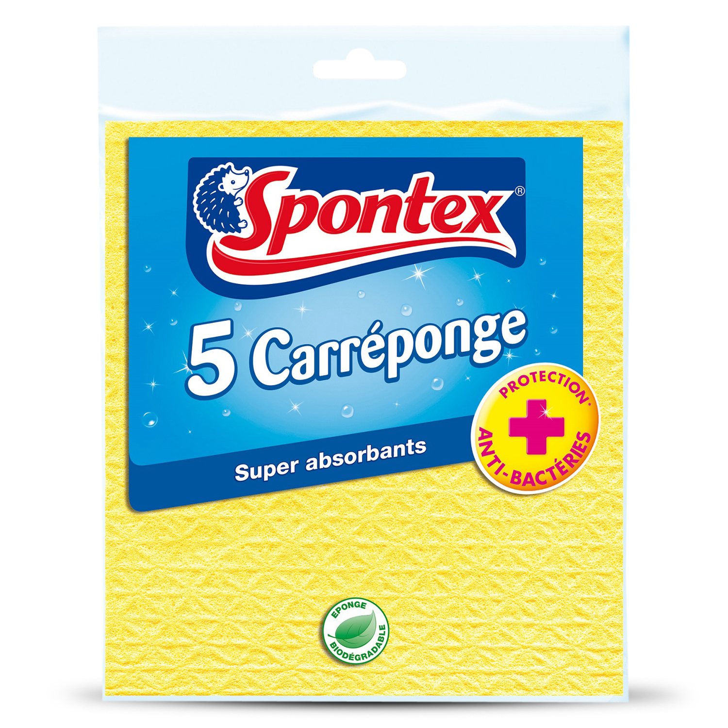 5 carrés vaisselle en éponge végétale avec trame - 4 couleurs aléatoires : jaune, violet, vert & rose - Doux et très maniables - Très absorbants - Lavables en machine à laver le linge (40°) CARREPONGE x5