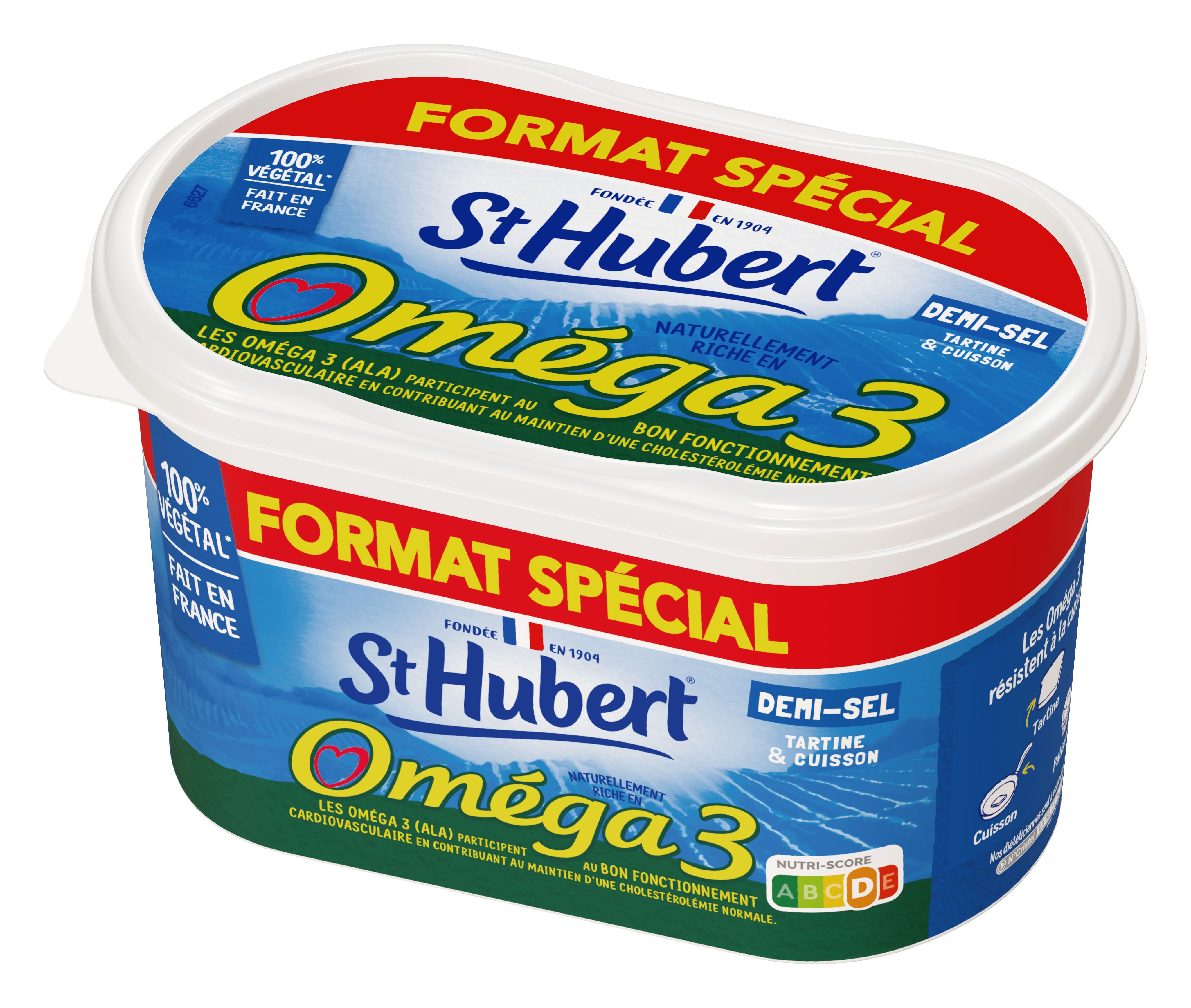 St Hubert Oméga 3 ®, mon partenaire pour un bon équilibre nutritionel. Consommés en remplacement de votre matière grasse habituelle, les produits de la gamme St Hubert Oméga 3 ® contribuent à augmenter les apports en oméga 3 pour profiter de leurs bienfaits. Matière grasse à tartiner et à cuire allégée (52 % MG), enrichie en vitamine B1