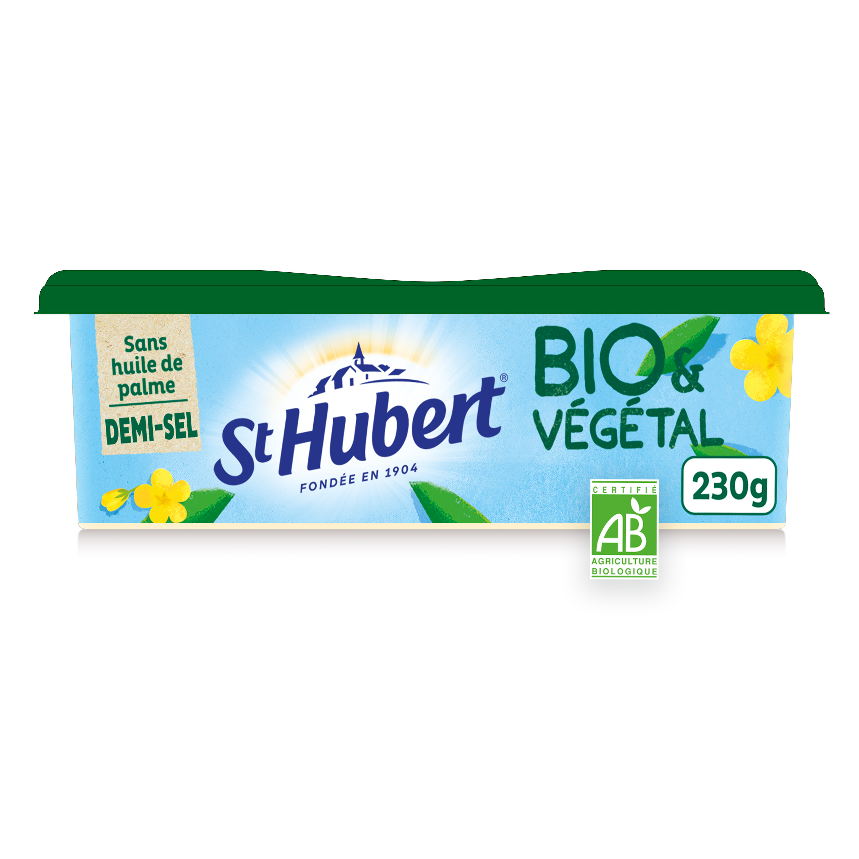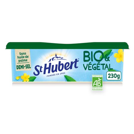 Matière grasse allégée à tartiner et à cuire issue de l'agriculture biologique (52% de MG) St Hubert BIO® est fabriqué en France, à partir de matières premières agricoles biologiques d'origine végétale, et participe ainsi à la construction de la démarche responsable de l'entreprise St Hubert. L’emballage, composé de 70% de carton, est recyclable. Sa recette est 100% végétale (100% des ingrédients agricoles sont d’origine végétale), sans huile de palme, sans arôme ajouté et sans colorant, et convient aux végétariens et aux végétaliens.