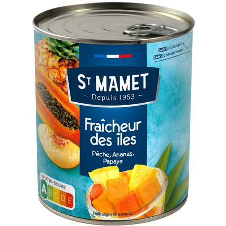 pêches en cubes (30 à 45%), segments d'ananas (8 à 15%), papayes en cubes (3 à 8%), eau, sirop de glucose-fructose, sucre, acidifiant : acide citrique, arôme naturel.