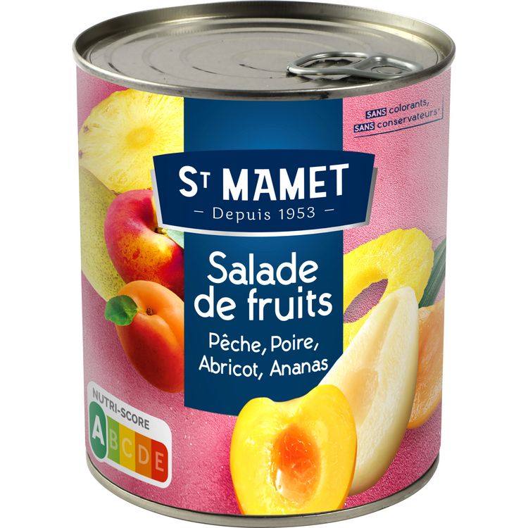 Fruits en proportions variables (pêches, poires), eau, fruits en proportions variables (abricots, ananas), sucre, acidifiant : acide citrique, antioxydant : acide ascorbique.