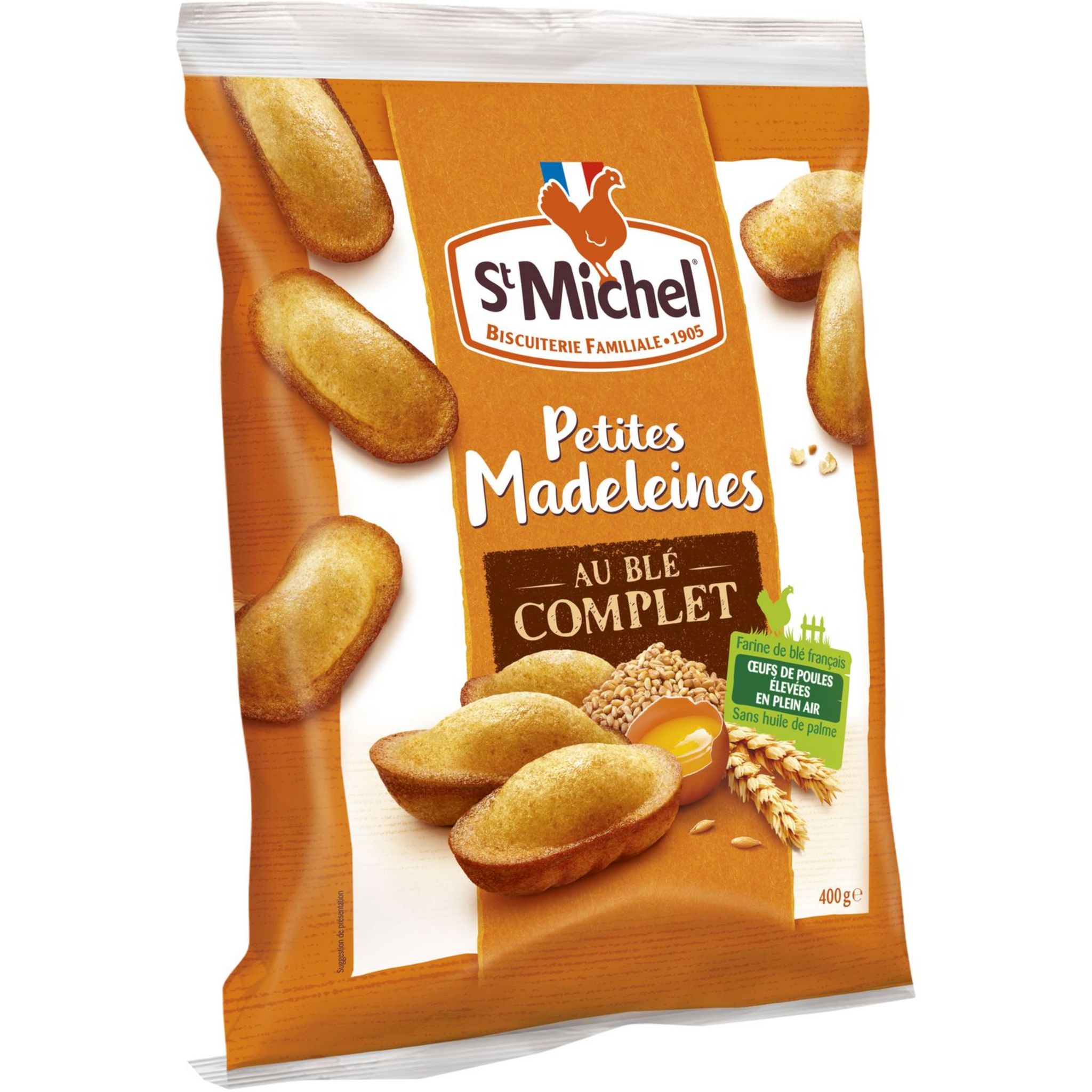 farines (farine complète de BLE 17%, farine de BLE 13%), huile de colza, sucre, OEUFS de poules élevées en plein air (17%), stabilisant : glycérol, sirop de glucose-fructose, amidons (BLE), poudres à lever : diphosphates et carbonates de sodium (BLE), sel, arôme naturel. Contient SOJA.