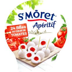Tout le plaisir frais du St Môret dans une bille au délicieux cœur fondant de tomates pour des apéros gourmands. Fromage au lait de vache pasteurisé avec fourrage aromatisé tomates.