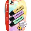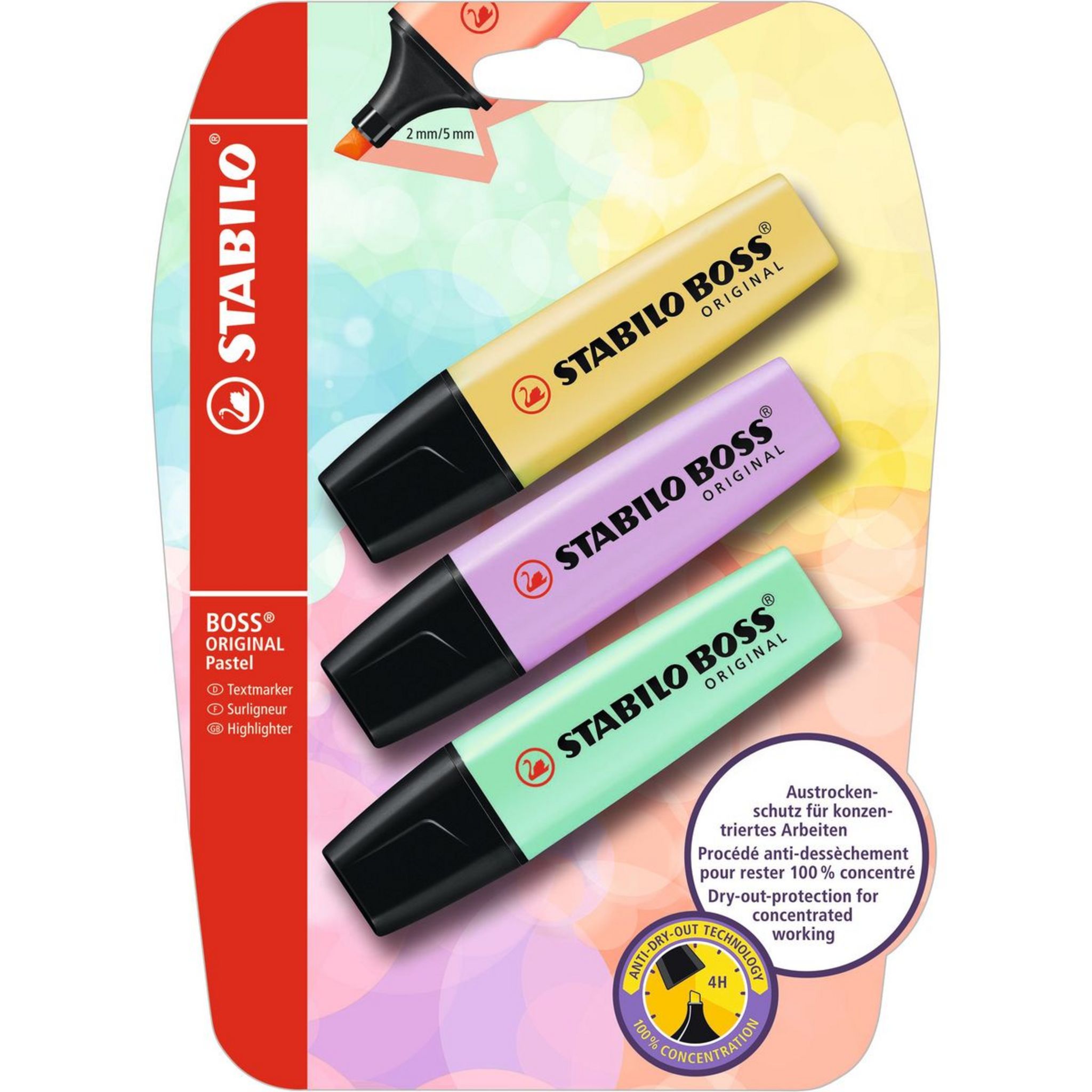 Blister x 3 surligneurs STABILO BOSS ORIGINAL Pastel - jaune + lilas + menthe STABILO BOSS ORIGINAL se décline en version pastel et devient plus qu'un simple surligneur...un véritable instrument de création artistique, pour surligner bien sûr, mais aussi dessiner, colorier ou décorer, avec un rendu plus doux et plus moderne ! Sa pointe biseautée offre 2 largeurs de tracé (2 et 5 mm). Le surligneur STABILO BOSS ORIGINAL Pastel c'est également une capacité de 350 mètres de surlignage résistant à la lumière sur tous les papiers.