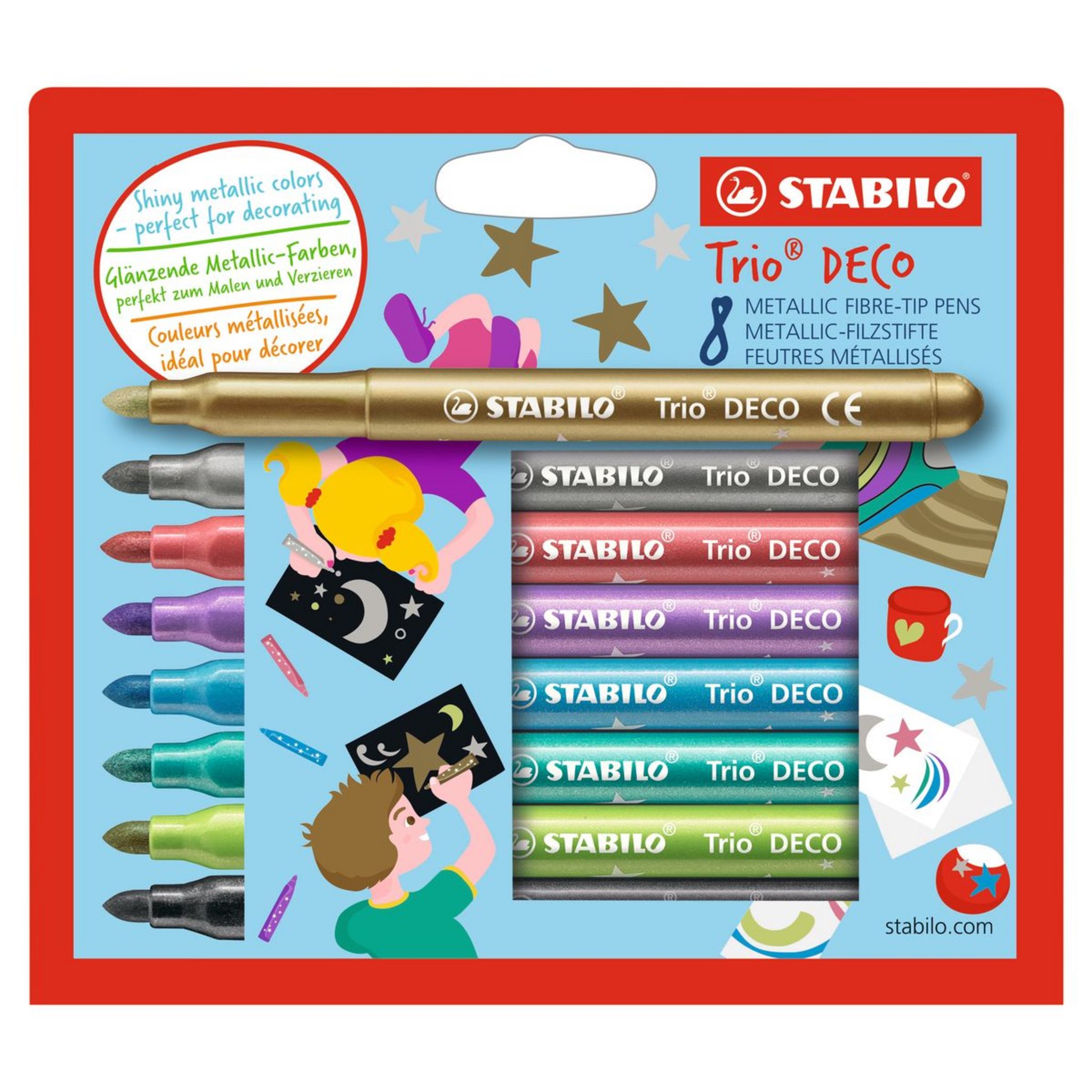 STABILO Trio DECO est un feutre de coloriage métallisé idéal sur papiers foncés. Décoration, personnalisation de carte, scrapbooking ou bien encore simple coloriage : ses seules limites seront celles de votre imagination ! Encre permanente pour le papier,le bois et la plupart des surfaces poreuses.