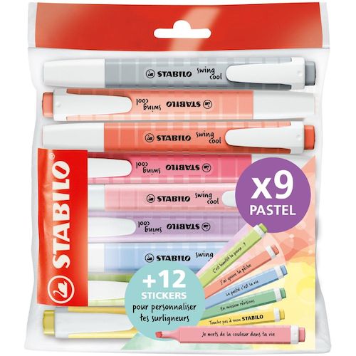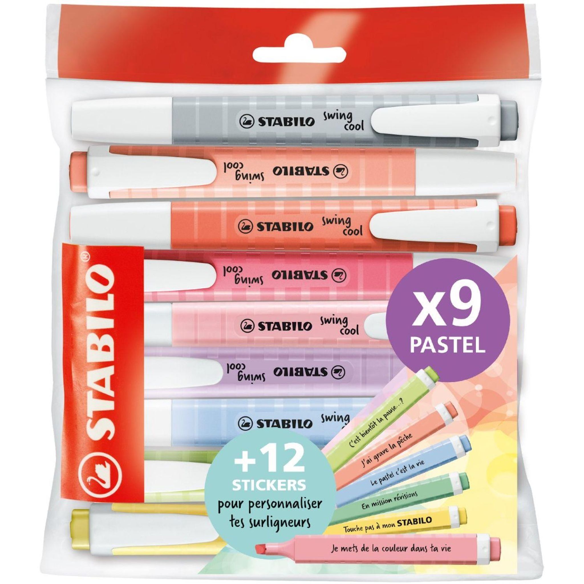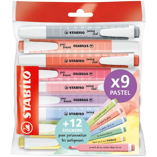 Lot de 9 surligneurs pastels Swing Cool + 12 stickers à message