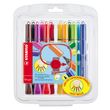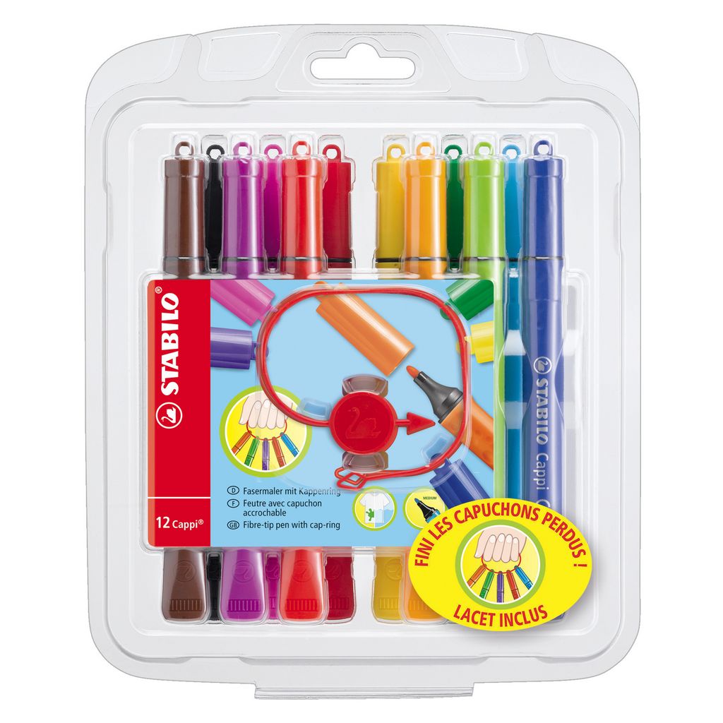 Un capuchon malin muni d’un petit anneau, il s’enfile sur un lacet plastique fourni avec chaque pochette. 12 feutres pointe moyenne. Fini, les capuchons perdus !
