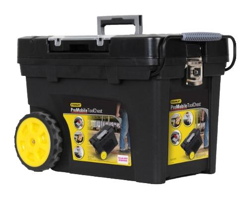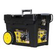 Coffre de chantier avec couvercle amovible et poignée télescopique de transport. Volume utile de 53L. Couvercle équipé d',un organiseur détachable et d',une rainure en V pour les coupes d',appoint. Crochets de fermeture métalliques verrouillables par cadenas. Grandes roues tout terrain.