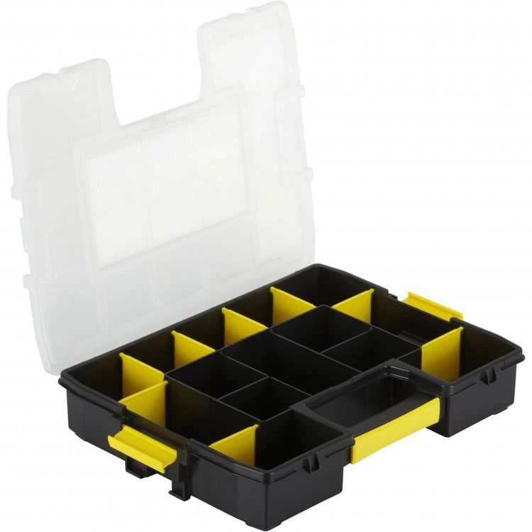 Version compacte de l'organisateur Sortmaster, la mallette Sortmaster Junior 1-97-483 de la marque STANLEY est un accessoire de rangement et d'organisation dédié aux professionnels et aux particuliers pour le rangement de nombreux pièces et éléments. L'organiseur est constitué de 14 compartiments avec 5 cellules centrales fixes et de 9 autres cellules à bords amovibles. Grâce à ces derniers, il devient possible d'étendre la surface de stockage pour permettre de ranger des objets de plus grande dimension comme les outils à main. Ce système innovant augmente drastiquement le niveau de personnalisation du rangement en offrant 512 configurations de compartiments possibles à l'organiseur. De dimensions moindres, l'organiseur Sortmaster Junior mesure 375x67x292 mm. Cette petite taille privilégie un transport aisé et un rangement peu encombrant, idéal pour les ateliers à espace restreint. La capacité de stockage de chaque mallette est de 3,6 litres, mais il est possible d'empiler plusieurs exemplaires ensemble pour bénéficier de plus d'espace. Une fois fixés, l'ensemble est facile à transporter à l'aide d'une poignée qui offre un bon maintien. Pour protéger les éléments rangés, l'organiseur est pourvu d'un couvercle constitué de polycarbonate résistant aux chocs. De couleur transparente, le couvercle est pratique car il offre une visibilité claire de l'intérieur de l'organiseur pour en déterminer le contenu.