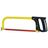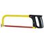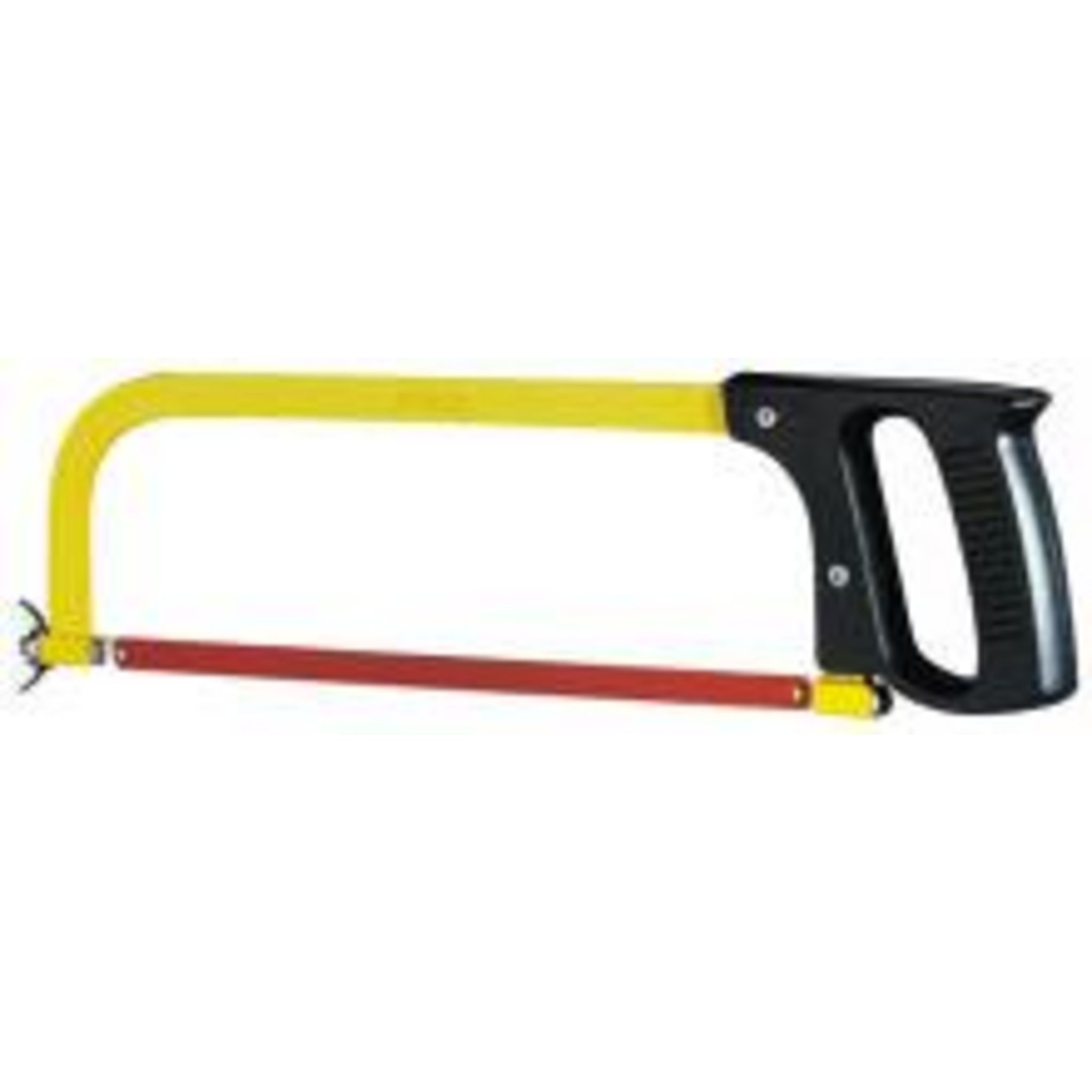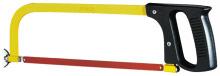 Poignée revolver et arc plein en acier laqué jaune de section rectangulaire. Poignée vissée en matière synthétique noire. Lame orientable. Utilise des lames de 300 mm.