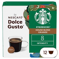 Café torréfié moulu Découvrez STARBUCKS Grande House Blend, un café 100% Arabica à préparer chez vous avec votre machine NESCAFE DOLCE GUSTO. Une torréfaction ambrée permet un rendu en tasse équilibré, un café riche aux notes de caramel. Un format boîte contenant 12 capsules vous permet de préparer 12 tasses de Grande House Blend. Intensité 8/12.