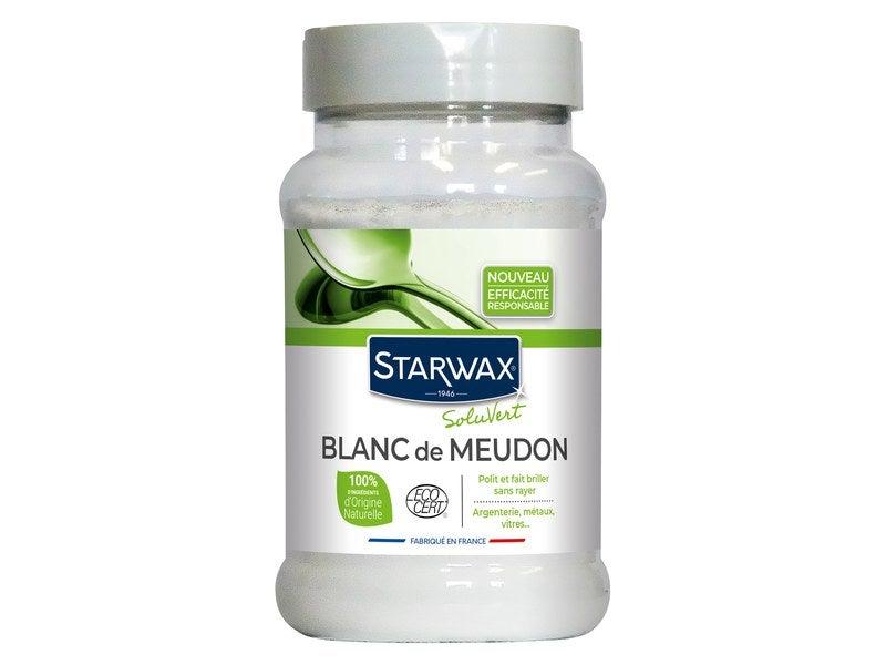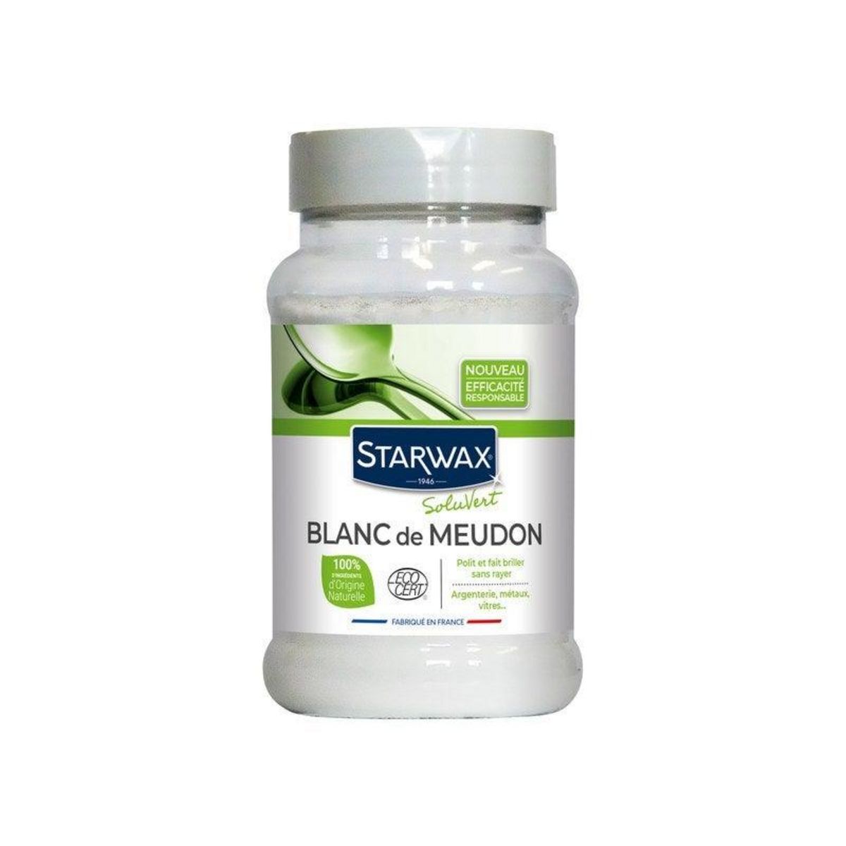 Nom du produit : Blanc de MeudonMarque du produit : STARWAXUsage du produit : NettoyerConseil d'utilisation : Argenterie, métaux 1 dose de blanc de Meudon pour 1/2 dose d'eau. Appliquer, laisser sécher 30 min. puis essuyer avec un chiffon doux. Vitres, miroirs, plaques vitrocéram (nettoyage) Dilue
