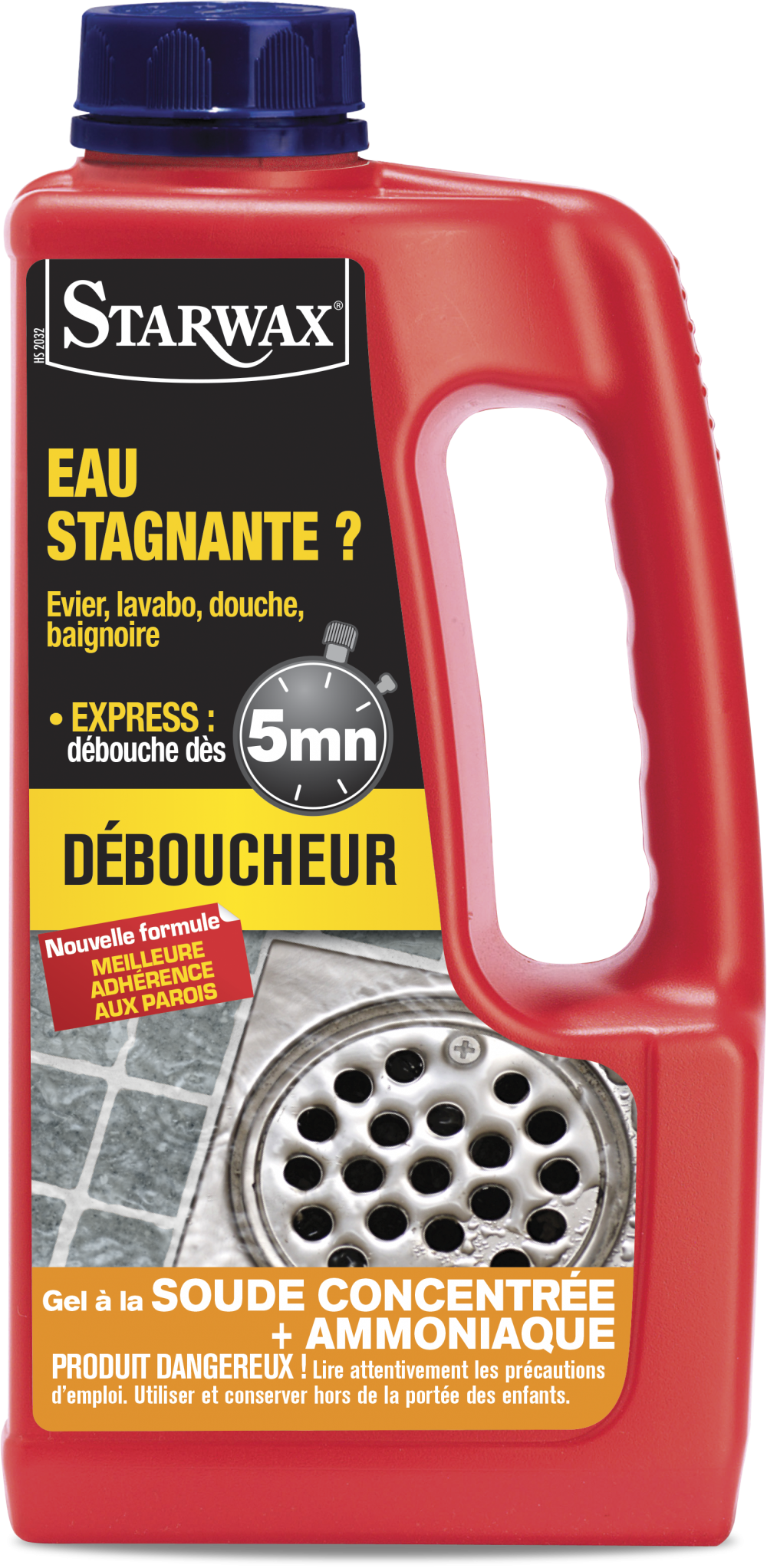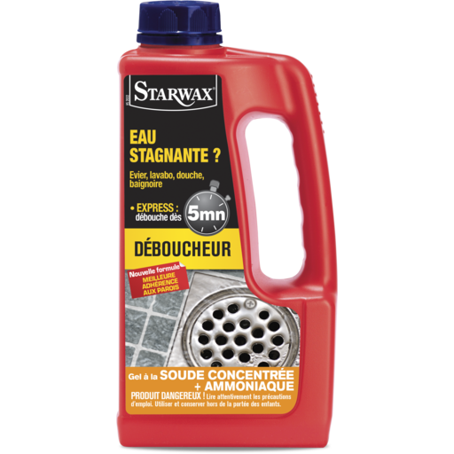 Spécial eau stagnante, évier, lavabo, douche et baignoire. Evite d'écoper. A la soude concentrée et à l'amoniacGrâce à sa formule en gel express, le produit se concentre sur le bouchon et agit en 5 minutes sur les matières organiques, graisses, cheveux, même en eau stagnante quand la canalisation e