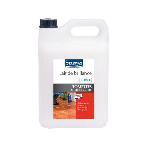 Nom du produit : Lait de brillanceType de produit : Lait de brillance pour tomettes et terres cuitesUsage du produit : EntretenirDestination : TometteContenance (en kg, l...) : 5 lMarque du produit : STARWAXConseil d'utilisation : Bien dépoussiérer le sol. Pour environ 60m² de sol à nettoyer, verse
