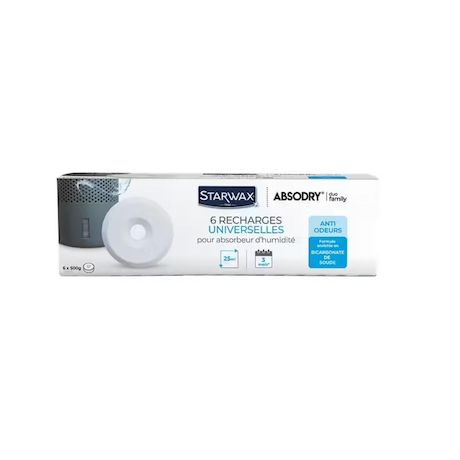 Starwax 001087 Pack de tablettes Starwax Absodry 001087 de Starwax.Les recharges universelles Starwax Absodry sont étudiées pour recharger tous les absorbeurs d'humidité pouvant accueillir des galets de 10 cm de diamètre, Grâce à leur formule hyper absorbante à base de chlorure de calcium enrichi au