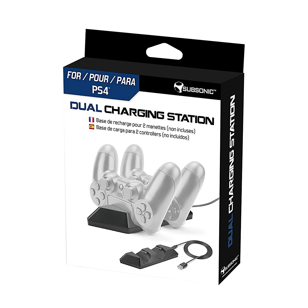 Base de recharge et de rangement pour 2 manettes DualShock®4 / Se branche directement sur le port USB de la console / Patins antidérapants pour plus de sécurité / Câble USB inclus.