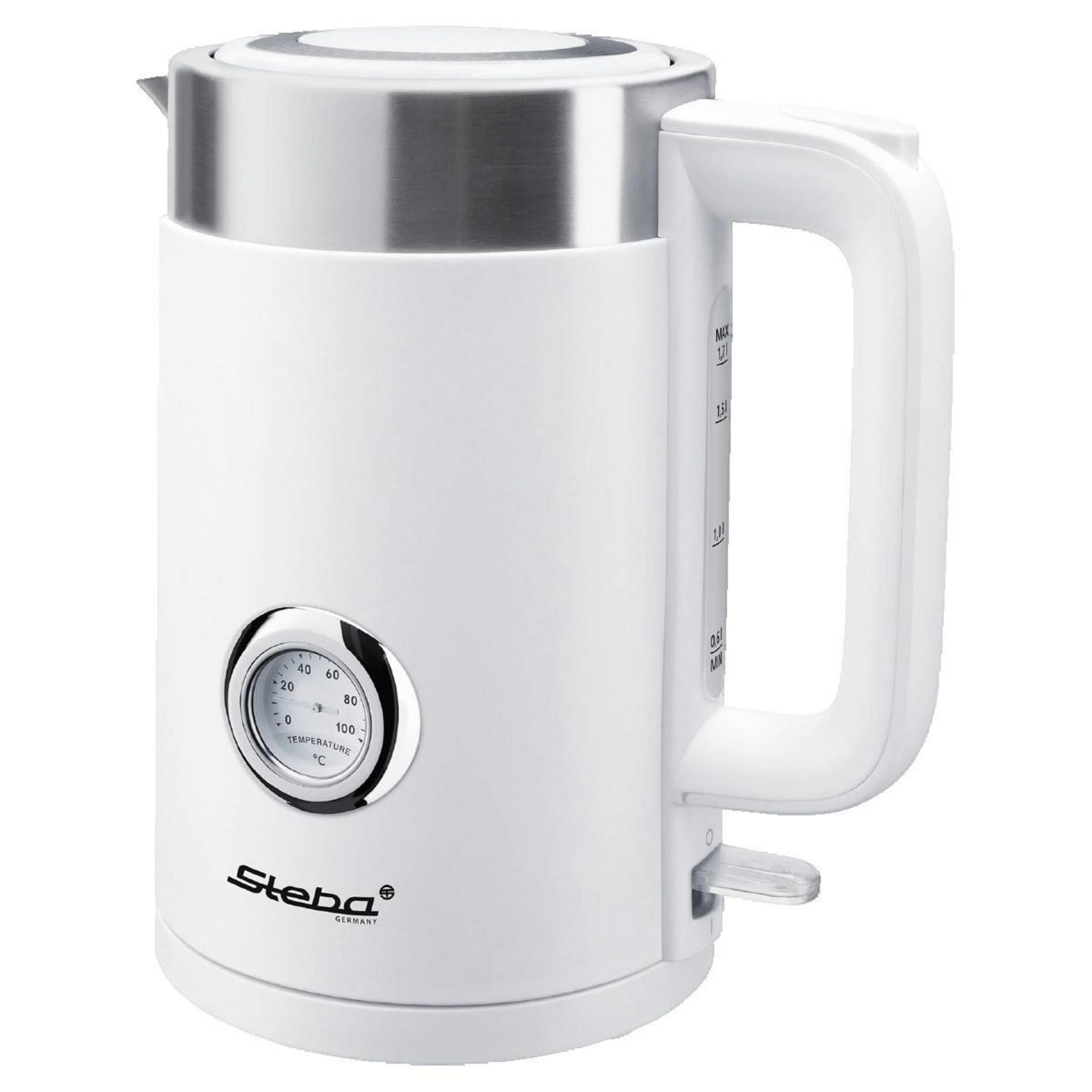 Découvrez la bouilloire électrique Steba WK 10 Bianco, idéale pour la cuisine. Cette bouilloire moderne blanche dispose d'une capacité de 1,7 litre et offre un affichage de température jusqu'à 100 °C. Sans fil, elle est équipée d'une base rotative à 360° et d'une fonction d'arrêt automatique pour ga