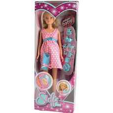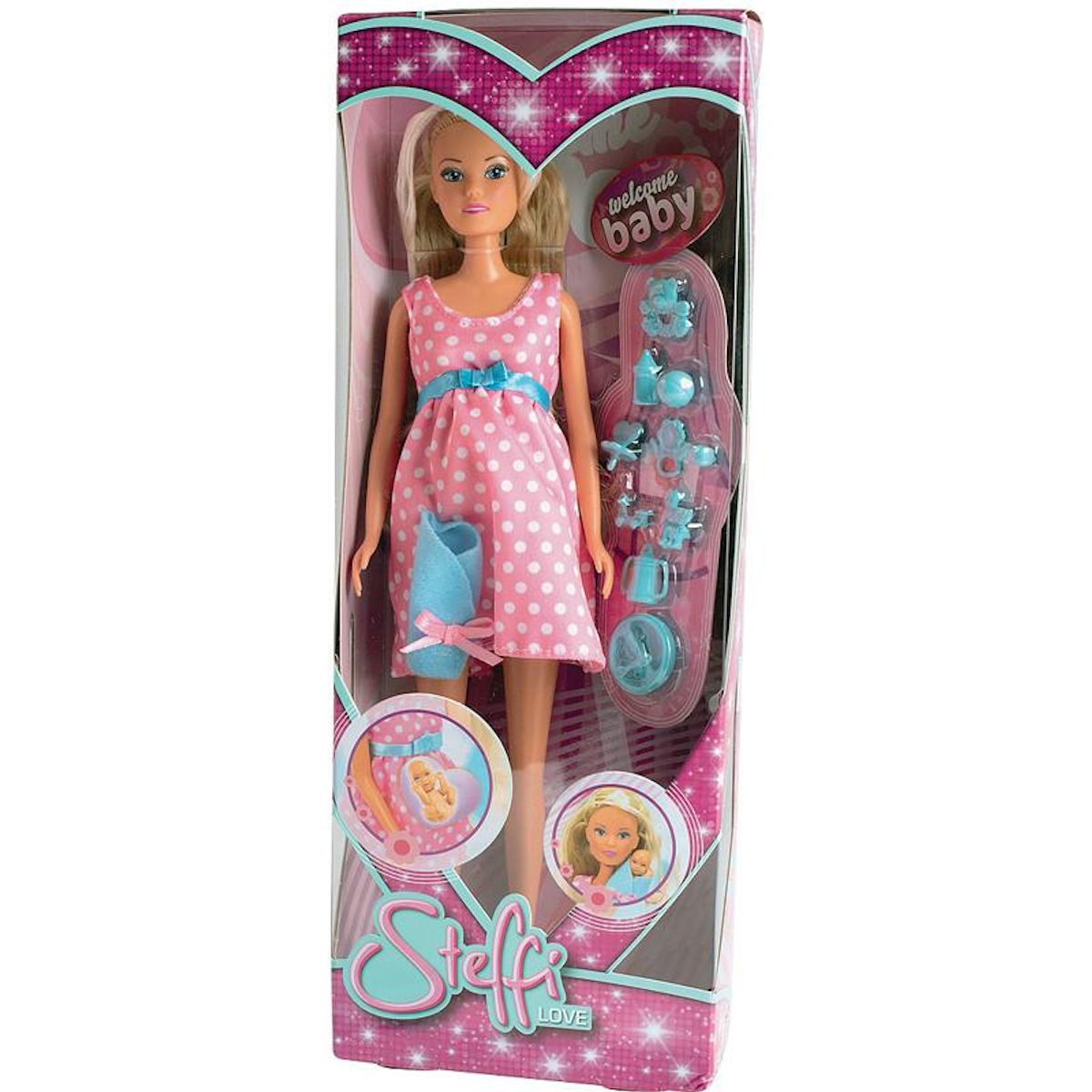 Poupée mannequin 29 cm. Steffi est enceinte. Elle porte le bébé dans son ventre : il se désolidarise pour laisser sortir le bébé (5cm). Avec 10 accessoires inclus pour s'occuper du nouveau-né : peluche, biberons, hochets, assiette et autres. A partir de