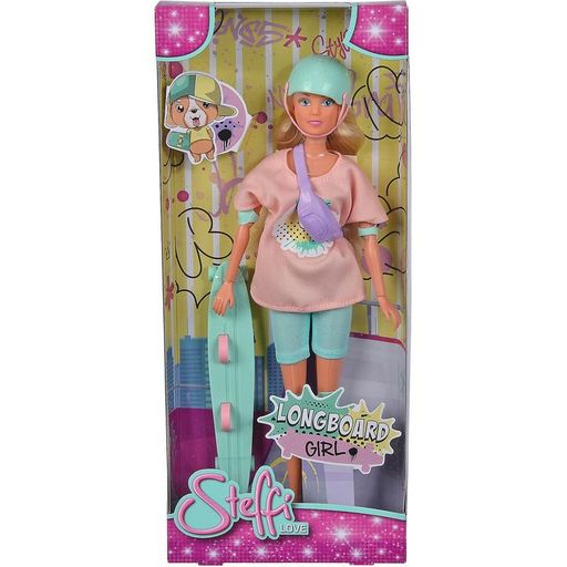 Poupée mannequin de 29 cm. Steffi porte une tenue tendance et sportive pour faire du longboard. Elle a un équipement de protection pour genoux, coudes, un casque et un sac banane. Poupée articulée. À partir de 3 ans.