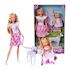 Poupée mannequin 29cm et Poupée Evi. Steffi et Evi partent en promenade avec leurs deux chiens dalmatiens : le chiot et sa maman de 15cm de long. Evi a une trottinette et Steffi tient le dalmatien en laisse.
