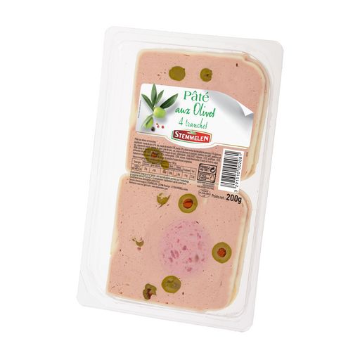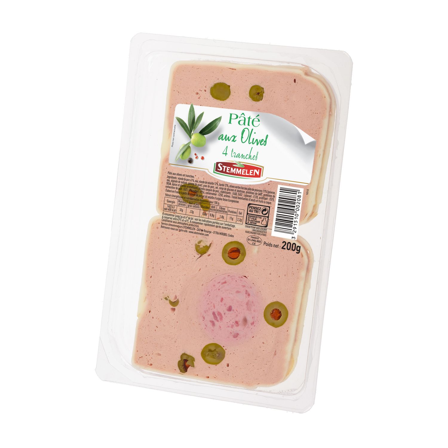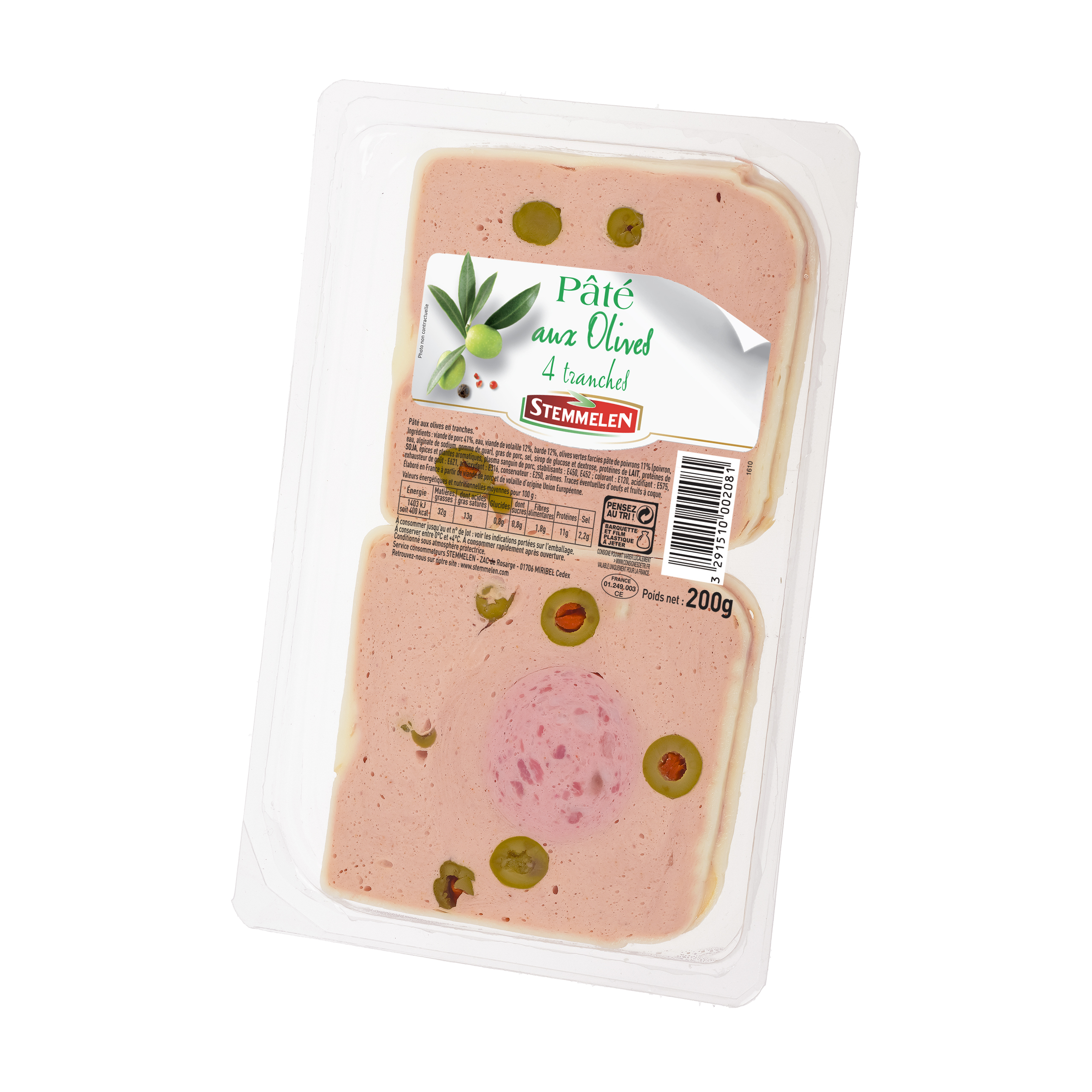 Ingrédients : viande de Porc (59 %, origine France), eau, barde (11%, origine UE), olives vertes farcies pâte de poivron 9% (eau, poivrons, stabilisants : E401, E412, épaississant : E509), gras de Porc (origine France), sel, protéines de LAIT, protéines de SOJA, épices et plantes aromatiques, plasma sanguin de porc, dextrose, colorant : E120, arômes naturels, exhausteur de goût : E621, stabilisants : E450, antioxydant : E316, arômes, conservateur : E250.