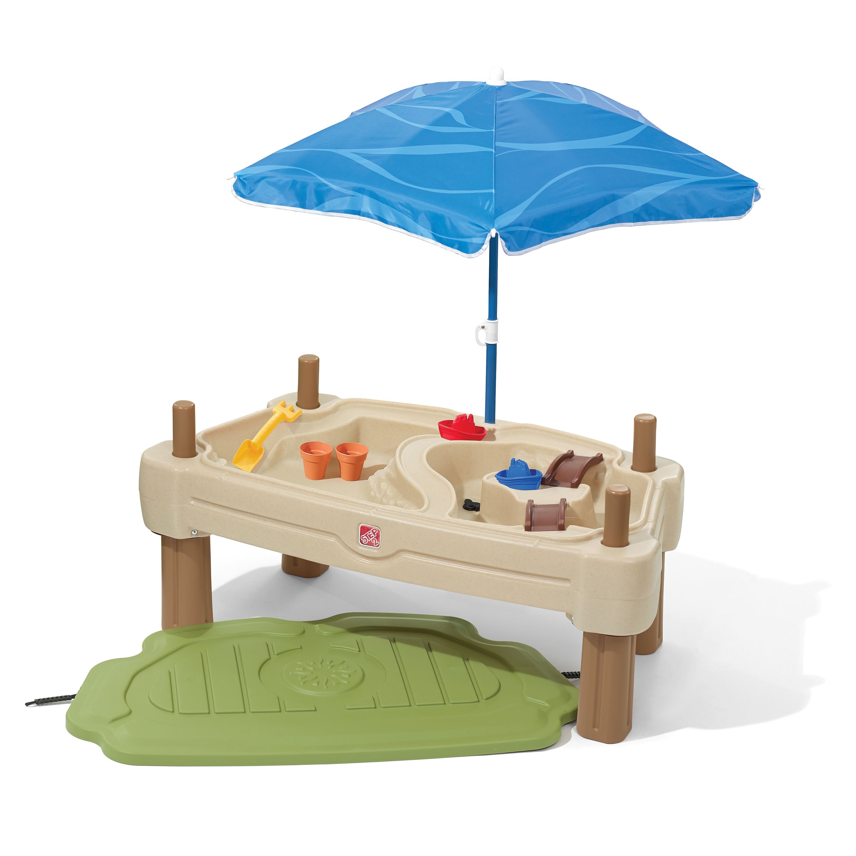 - Inclus : Parasol, 2 ponts, râteau / pelle combinés, 2 seaux, 2 bateaux.