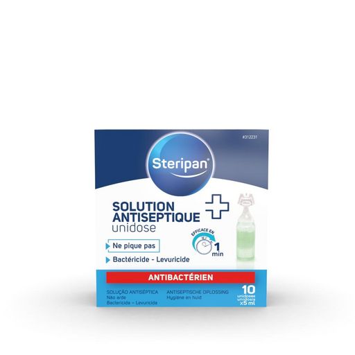 La solution antiseptique Steripan a une action bactéricide et levuricide sur la peau saine en 1 minute dans les conditions des normes EN 1040 et EN 1275. Elle élimine 99.9% des bactéries pour une parfaite hygiène de la peau saine : • Sans alcool, elle ne pique pas et convient aux enfants. • Ouverture facile pour une utilisation ultra-pratique. • Unidose de 5ml, conçue pour 1 application Ingrédients : Chlorhexidine digluconate : 0,5% (m/v) (n° CAS 18472-51-0) : 0.20 g. Formule colorée.