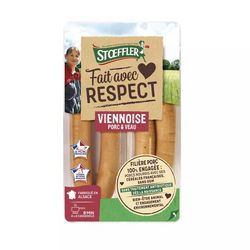 Saucisses cuites à pâte fine de porc et veau sous boyau naturel et légèrement fumées.
