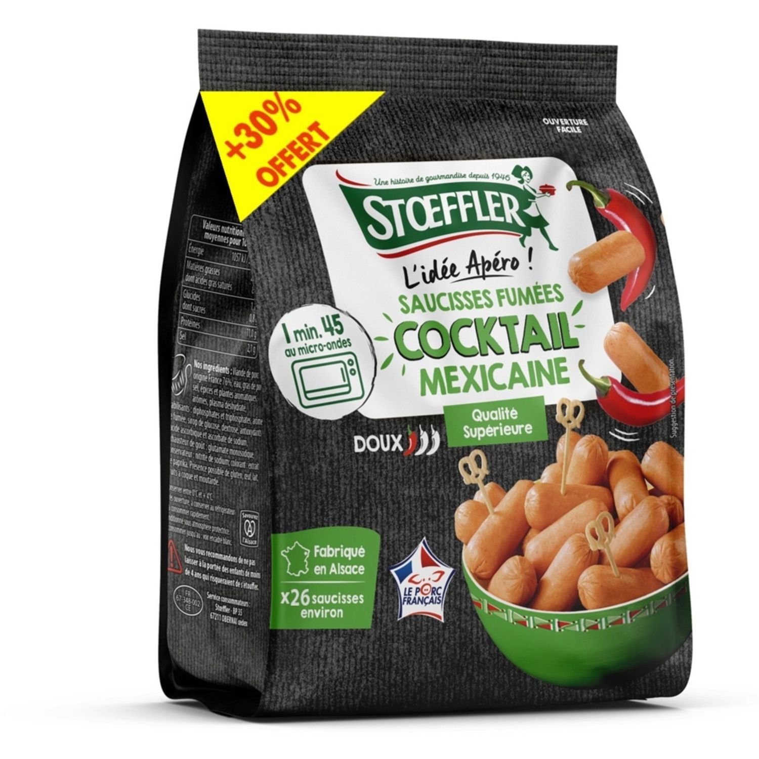 Petites saucisses à base d'une farce fine de maigre et gras de porc, saveur épices mexicaines, cuites et fumées. Stoeffler Saucisses cocktail fumées mexicaines VPF 200g + 30% offert