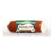 93% viande de porc (origine France), eau, sel, acidifiants : lactate de potassium, acétates de sodium ; épices, plasma de bŒUF déshydraté, dextrose, arômes naturels, 0.4% ail déshydraté, bouillon déshydraté (viande de porc, os de porc), antioxydant : acide ascorbique ; conservateur : nitrite de sodium ; colorant : carmins. Fumée de bois de hêtre. Peut contenir de traces de LAIT, d'OEUFS, de MOUTARDE, de céréales contenant du GLUTEN et de FRUITS A COQUE