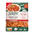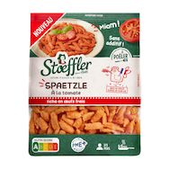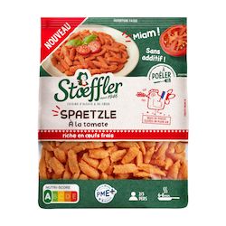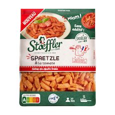 Farine de BLE*, double concentré de tomate** (25%), OEUF (22%), eau, huile végétale de colza, sel, ferments**, LAIT***. Peut contenir de la MOUTARDE et des FRUITS À COQUE.. *Origine France. **Origine UE *** Le LAIT provient d'autres recettes concoctées sur la même ligne de production que les spaetzle.
