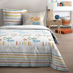 Très belle housse de couette DOLCE VITA pour lit 2 personnes de dimensions 260x240cm en 100% coton au tissage très serré 57 fils avec ses 2 taies d'oreillers 63x63 cm. Vous allez adorer son imprimé très coloré plein de bonnes ondes pour bien démarrer la journée ! Information sur la housse de couette