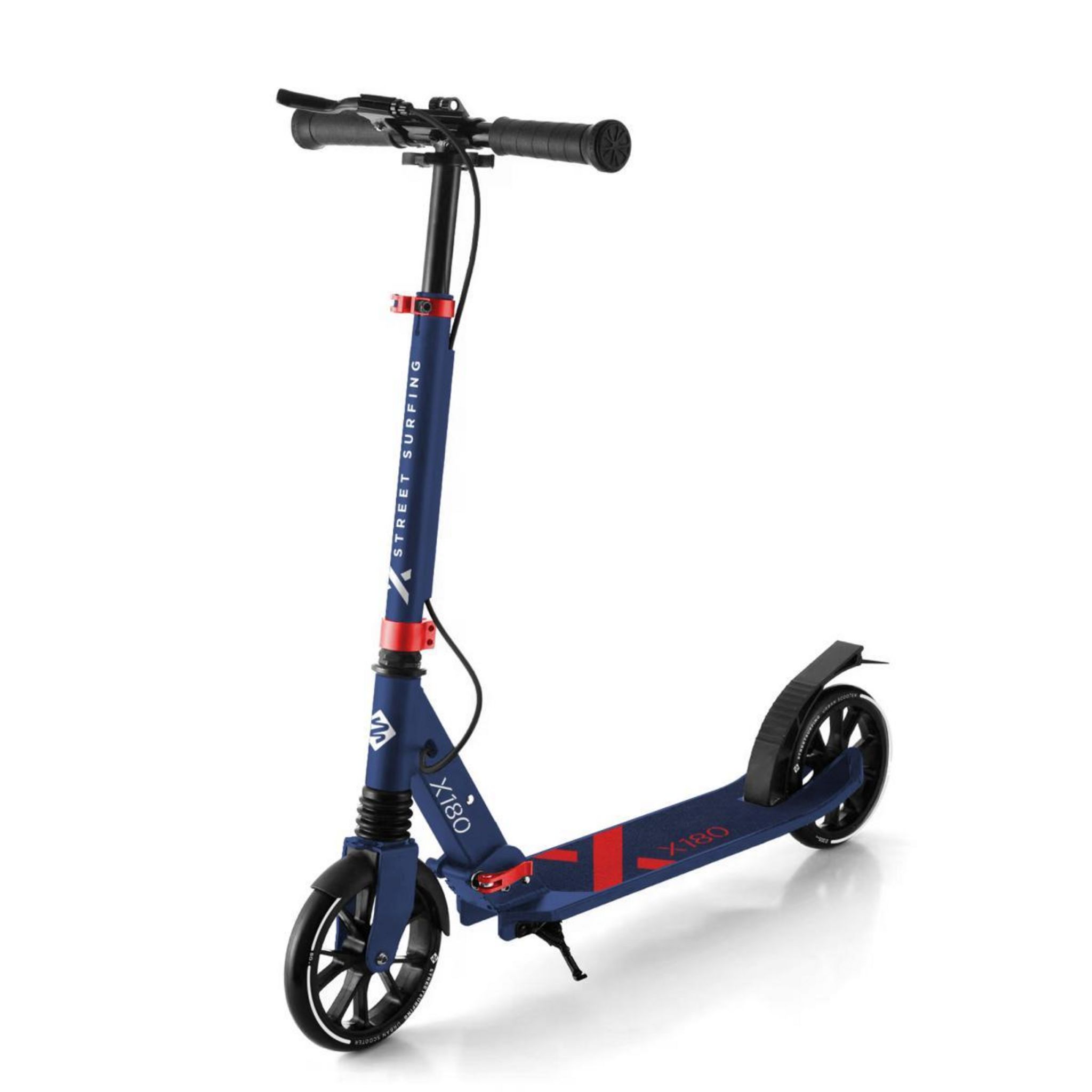 Plateau en aluminium renforcé : 550 mm x 120 mm. Guidon réglable en aluminium avec poignées TPR. Frein monté sur roue arrière. Suspension sur roue avant. Garde-boue roue avant. Mécanisme de pliage facile pour un rangement et un transport facilité. Béquille latérale. Frein arrière robuste. Roues PU 180 mm, roulements Abec 7