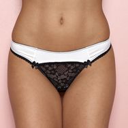 Mi-dentelle et mi-microfibre unie… on adore ce string femme ! Empiècement en dentelle contrastante sur le devant, transparent et doublé en tulle sur le haut. Jeu de surpiqûres contrastantes. Deux nœuds et bords féminins sur le devant, discrète goutte au dos. Fond doublé en coton pou